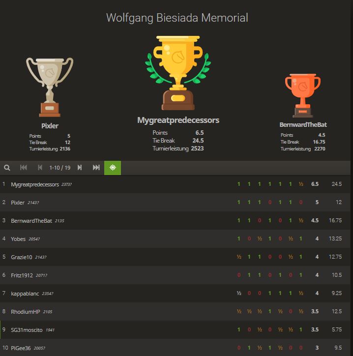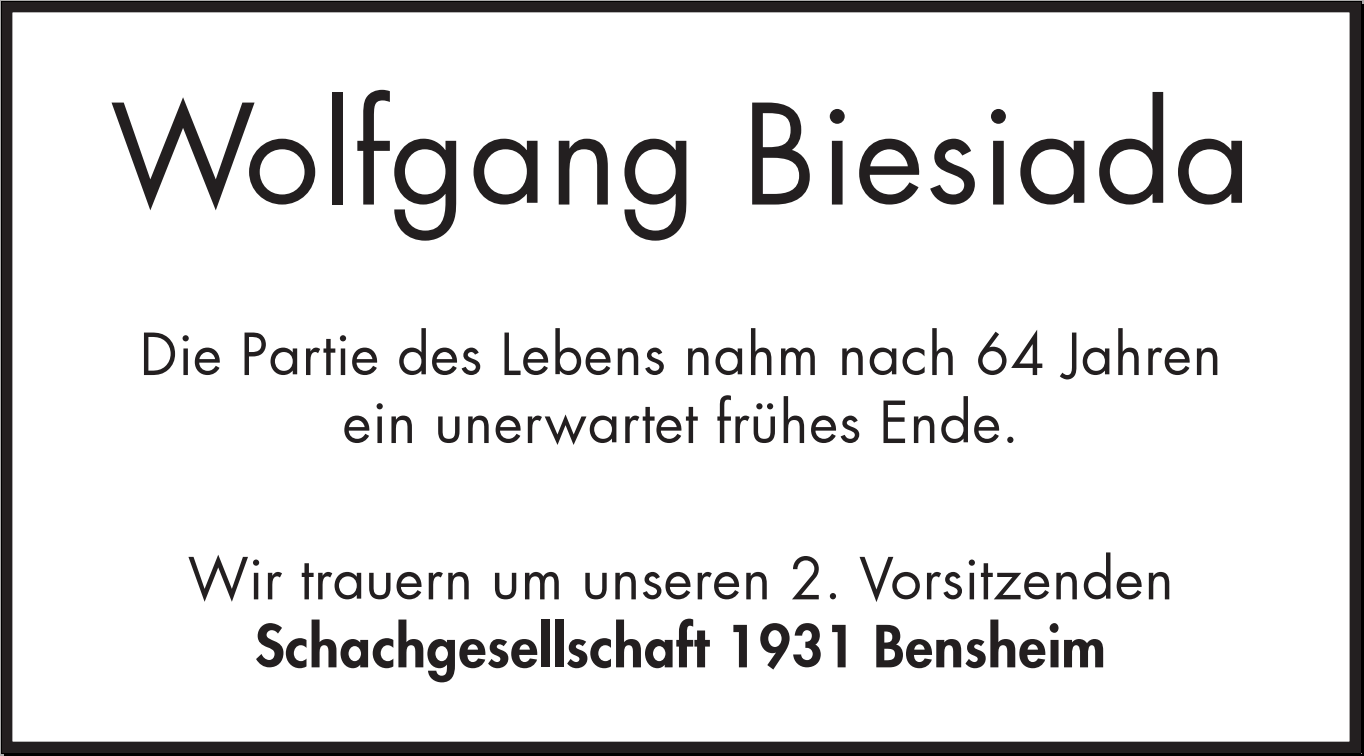 Leider lässt uns die Corona Zeit nicht viele Möglichkeiten Abschied zu nehmen, trotzdem wollen wir kommenden Freitag als erstes Zeichen ein Online Schnellschachturnier zu seinen Ehren durchführen. Hier der Link Wolfgang Biesiada Memorial und das Ergebnis: